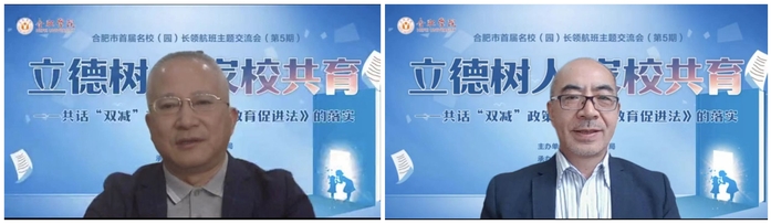 合肥九中党委书记、校长章伟,长丰县梅冲湖学校书记、校长高伟,合肥市翡翠学校党支部书记、校长丁文进,合肥市星海幼教集团总园长李莹分别以“‘六大行动’落实双减、‘学在九中’ 提质增效”、“全面学习《家庭教育促进法》,构建家校社立体网格”、“‘双减’背景下小学生校外成长共同体建设的实践与思考”和“让教育为每个人的成长铺路”为主题进行了交流发言。