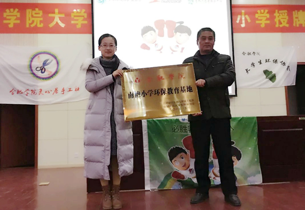 12月22日,校团委、大学生环保协会与南艳小学共建环保教育基地,授牌仪式在南艳小学顺利举行,校团委老师和南艳小学负责人、大学生环保协会及灵心居手工社的志愿者们参与了授牌仪式。